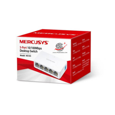 سوییچ شبکهی «MS105» محصولی از شرکت «mercusys» است که از پنج درگاه LAN برای اتصال کابلی به شبکه بهره میبرد. درگاههای این سوییچ از نوع 10/100 مگابیت بر ثانیه بوده و از استانداردهای IEEE برخوردار هستند. جنس بدنهی این محصول از پلاستیک باکیفیت است که در برابر آسیبهای روزمره، مقاومت خوبی از خود نشان میدهد. روی بدنهی این محصول، طرحی ساده مشاهده میشود که به زیبایی آن کمک شایانی کرده است. در قسمت بالای این سوییچ، نشانگرهای LED به چشم میخورند که میتوانند اطلاعات بسیار خوبی را از وضعیت کارکرد درگاهها و روشن بودن دستگاه ارائه کنند. این سوییچ انرژی خود را از یک آداپتور برق شهری تامین میکند. محل نصب درگاه آداپتور برق در گوشهی کناری دستگاه تعبیه شده است. اگر قصد دارید چند کامپیوتر یا دستگاه را به صورت باسیم به شبکهی کامپیوتری متصل کنید، سوییچ MS105 میتواند انتخاب مناسبی برایتان باشد. این سوییچ برای استفادههای غیرحرفهای طراحی و تولید شده است. ابعاد و وزن مناسب MS105 باعث میشود که فضای زیادی را اشغال نکند و بهراحتی بتوان آن را زیر میزها یا گوشههای دیوار مخفی کرد تا به زیبایی محیط آسیبی وارد نکند.